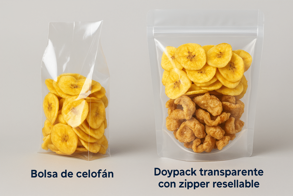 En el competitivo mercado de snacks en Panamá —donde productos como platanitos, yuquitas y chicharrones compiten por la atención del consumidor— el empaque puede marcar la diferencia entre ser una marca olvidada o una preferida. Aunque las bolsas de celofán han sido el estándar por años, hoy existen opciones ampliamente superiores: los doypacks transparentes con zipper resellable.